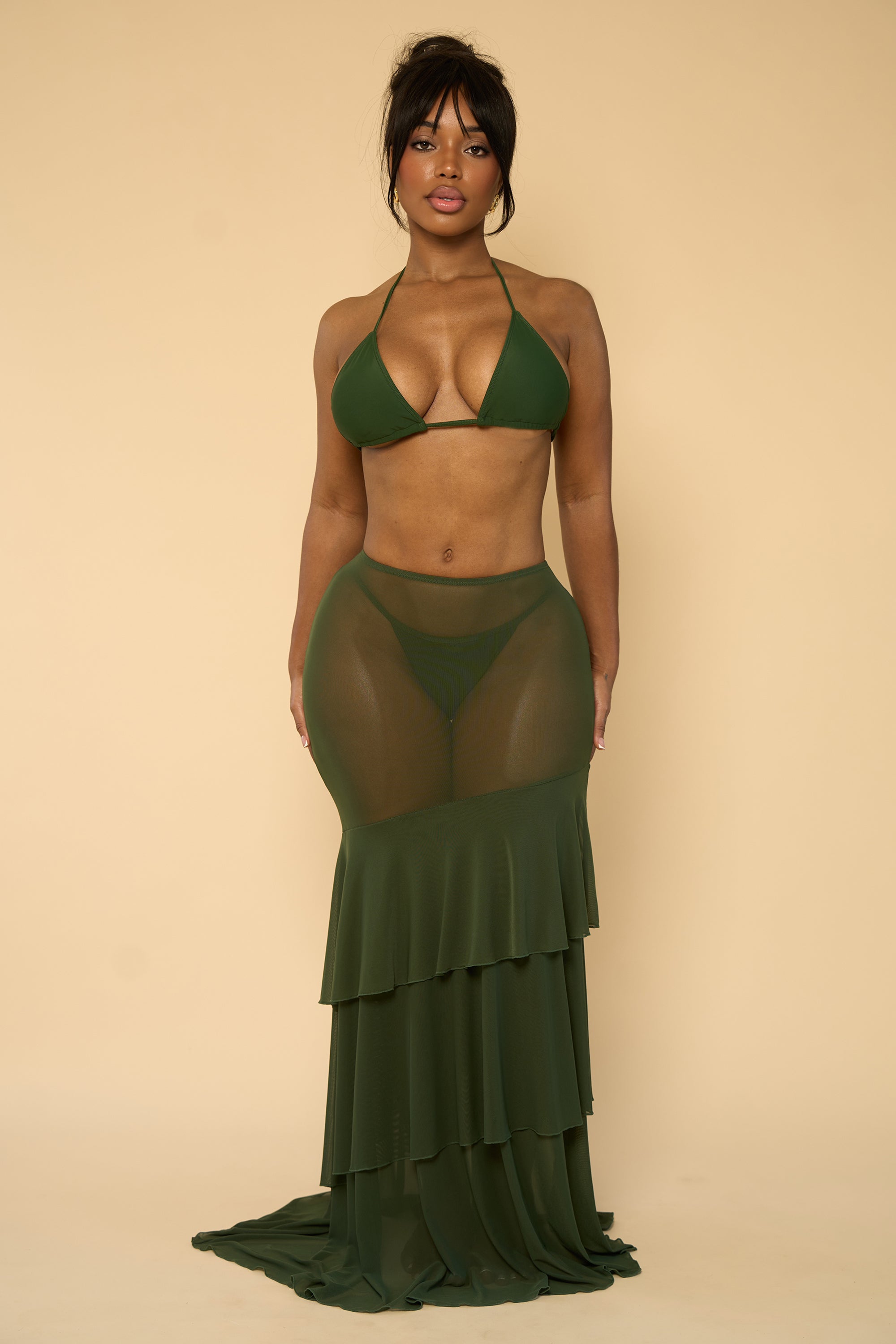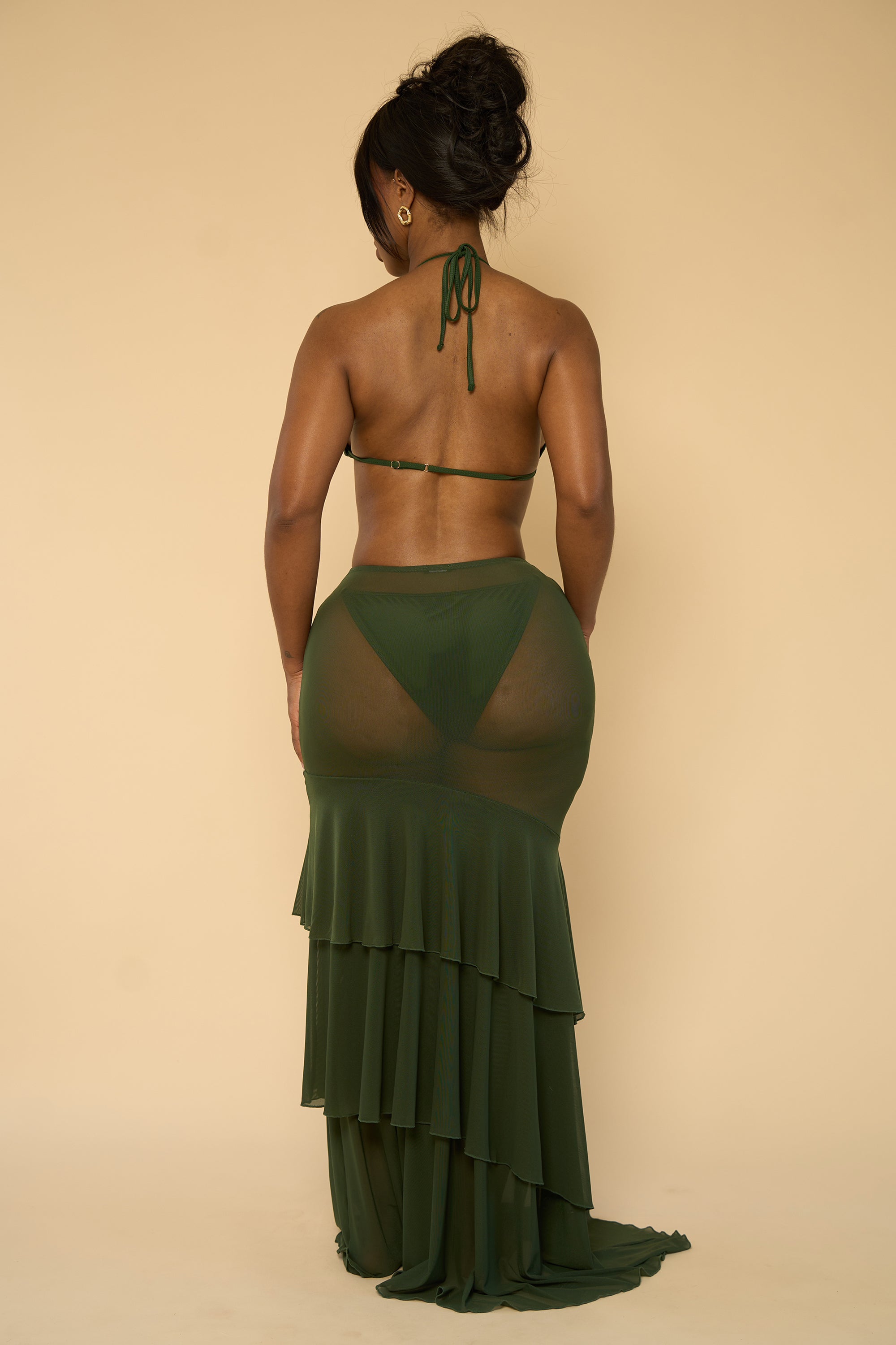 This sheer cover-up skirt is designed to elevate your swim look with effortless elegance. Crafted from a lightweight, sheer fabric, it softly drapes over the body while offering a flattering, high-waisted fit. The tiered ruffle detailing adds movement and dimension, creating a flowy silhouette that feels both romantic and resort-ready. Finished with a subtle flared hem, this skirt transitions seamlessly from beachside lounging to poolside cocktails, making it the perfect layering piece for any getaway. Skirt only.
