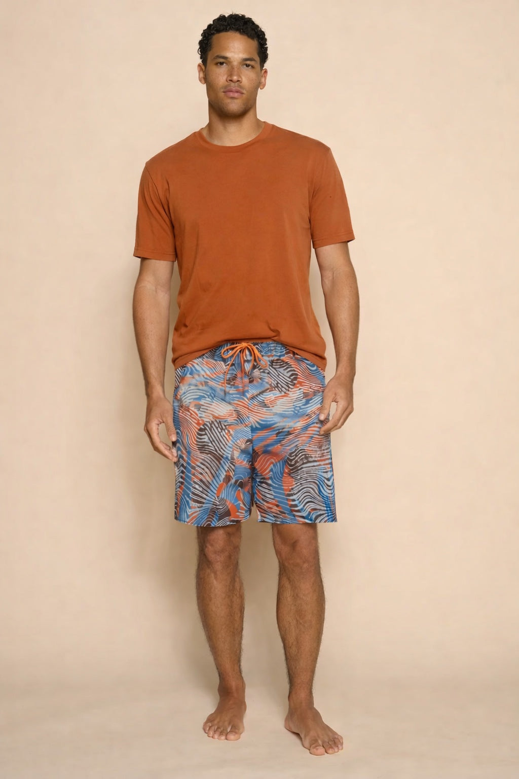 The shirt is a short-sleeve button-down style in russet orange. It has a relaxed, open-collar design, giving it a casual and breezy vibe perfect for warm-weather or beachwear settings. The fabric is lightweight and breathable, making it ideal for both comfort and style. The neutral color complements the overall minimalist and sophisticated aesthetic of the outfit. Shirt only.