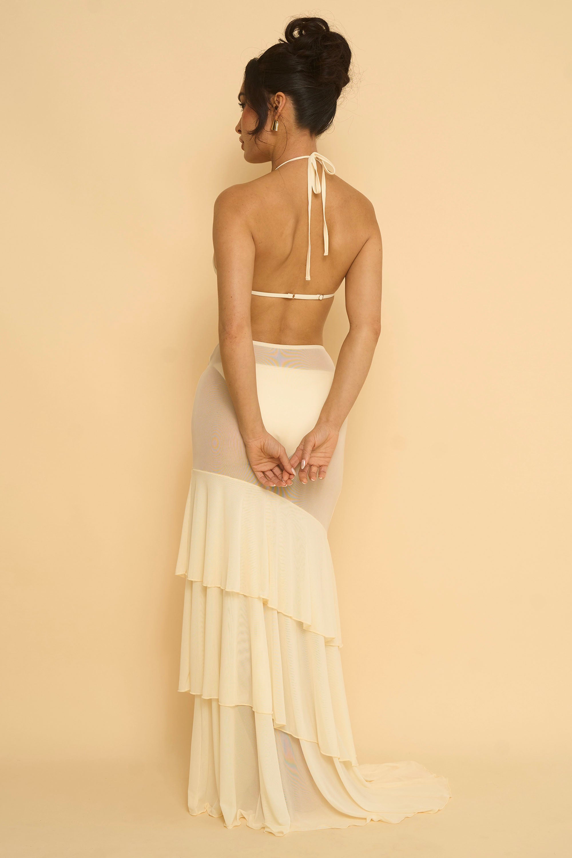 This sheer cover-up skirt is designed to elevate your swim look with effortless elegance. Crafted from a lightweight, sheer fabric, it softly drapes over the body while offering a flattering, high-waisted fit. The tiered ruffle detailing adds movement and dimension, creating a flowy silhouette that feels both romantic and resort-ready. Finished with a subtle flared hem, this skirt transitions seamlessly from beachside lounging to poolside cocktails, making it the perfect layering piece for any getaway. Skirt only.