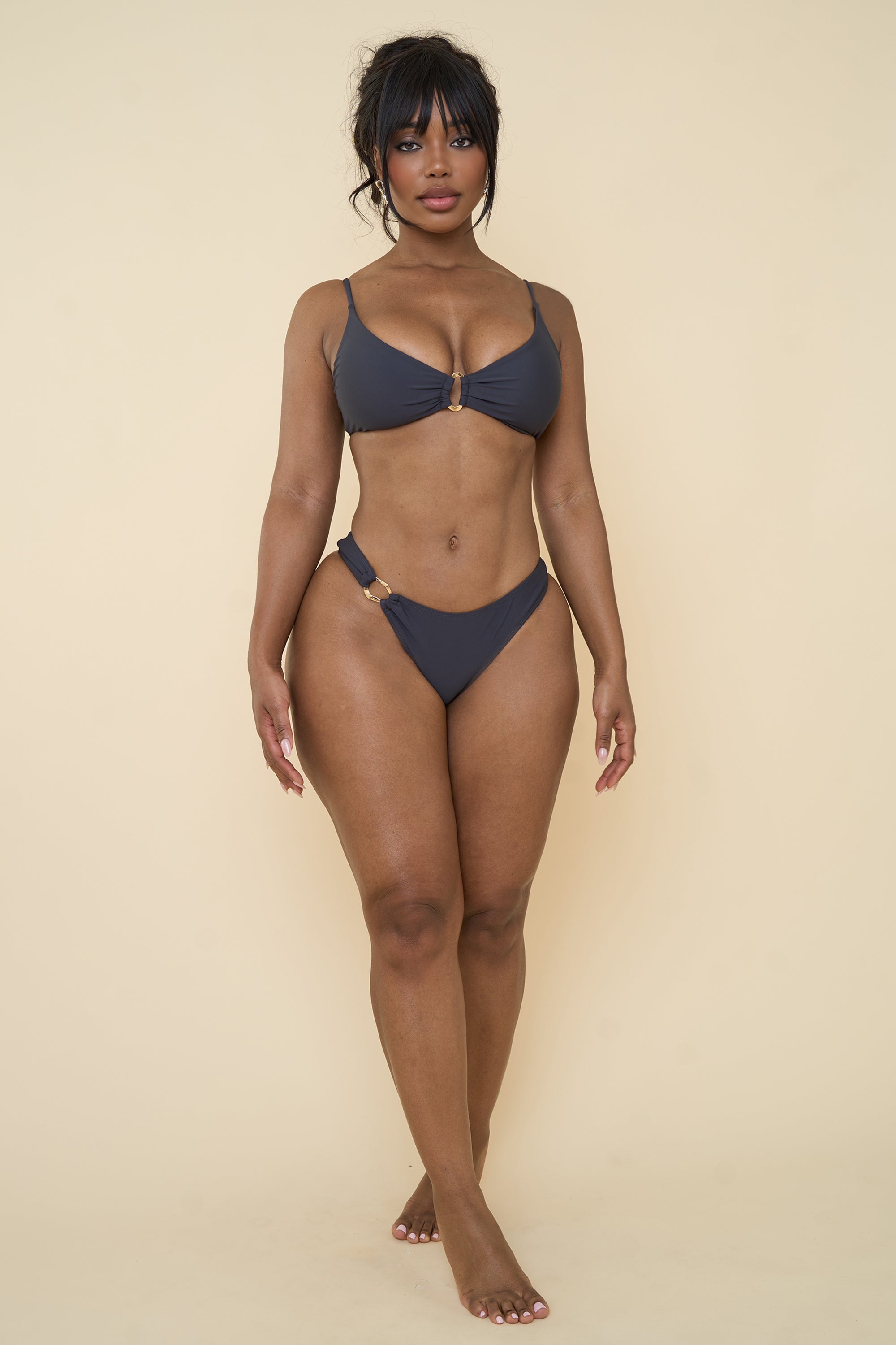 A sleek and modern two-piece bikini in a deep charcoal hue, designed for a clean yet elevated look. The top features a soft, scoop neckline with delicate straps and a gathered center detail accented by a gold-tone ring, adding a subtle touch of luxury.