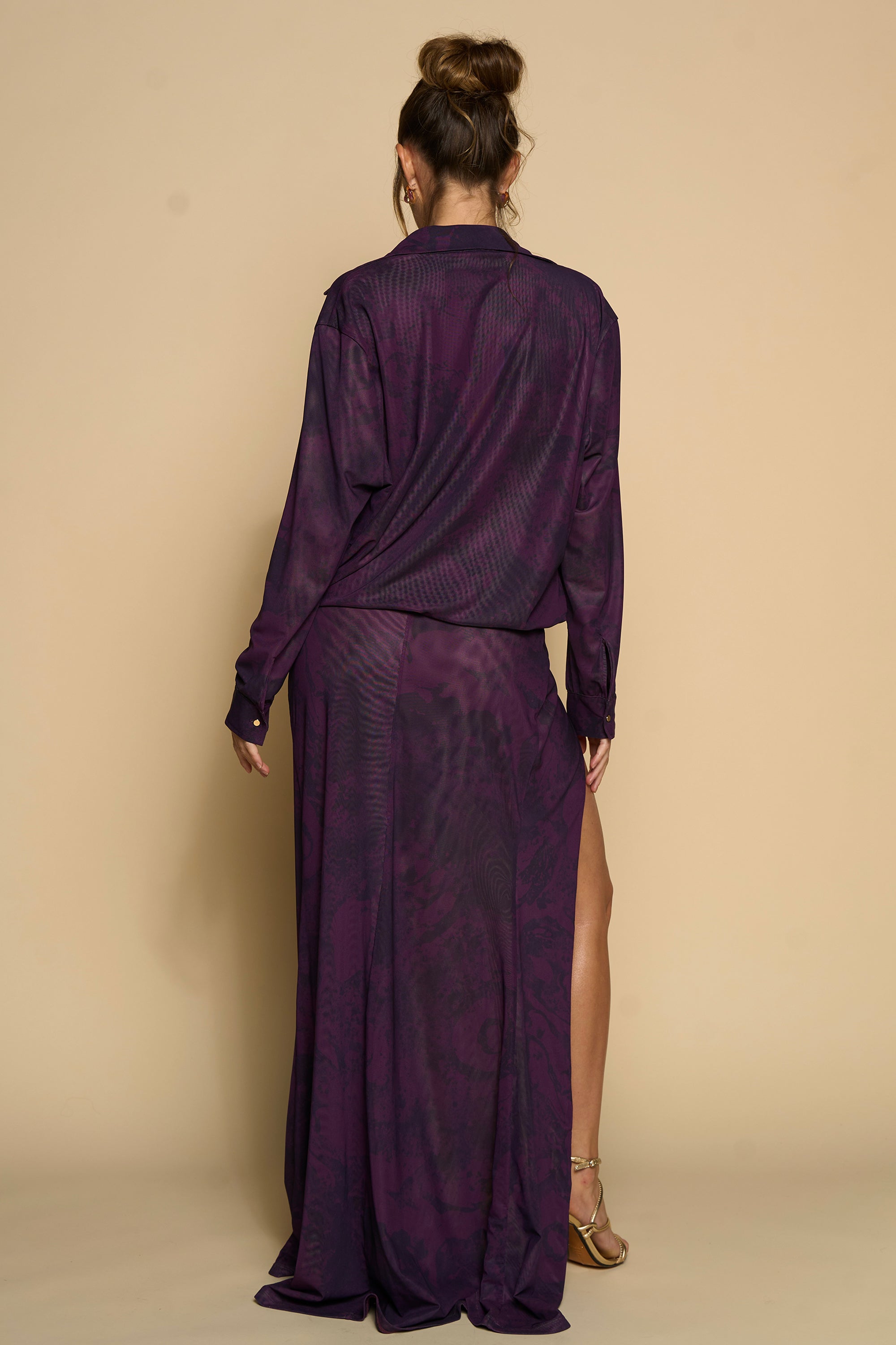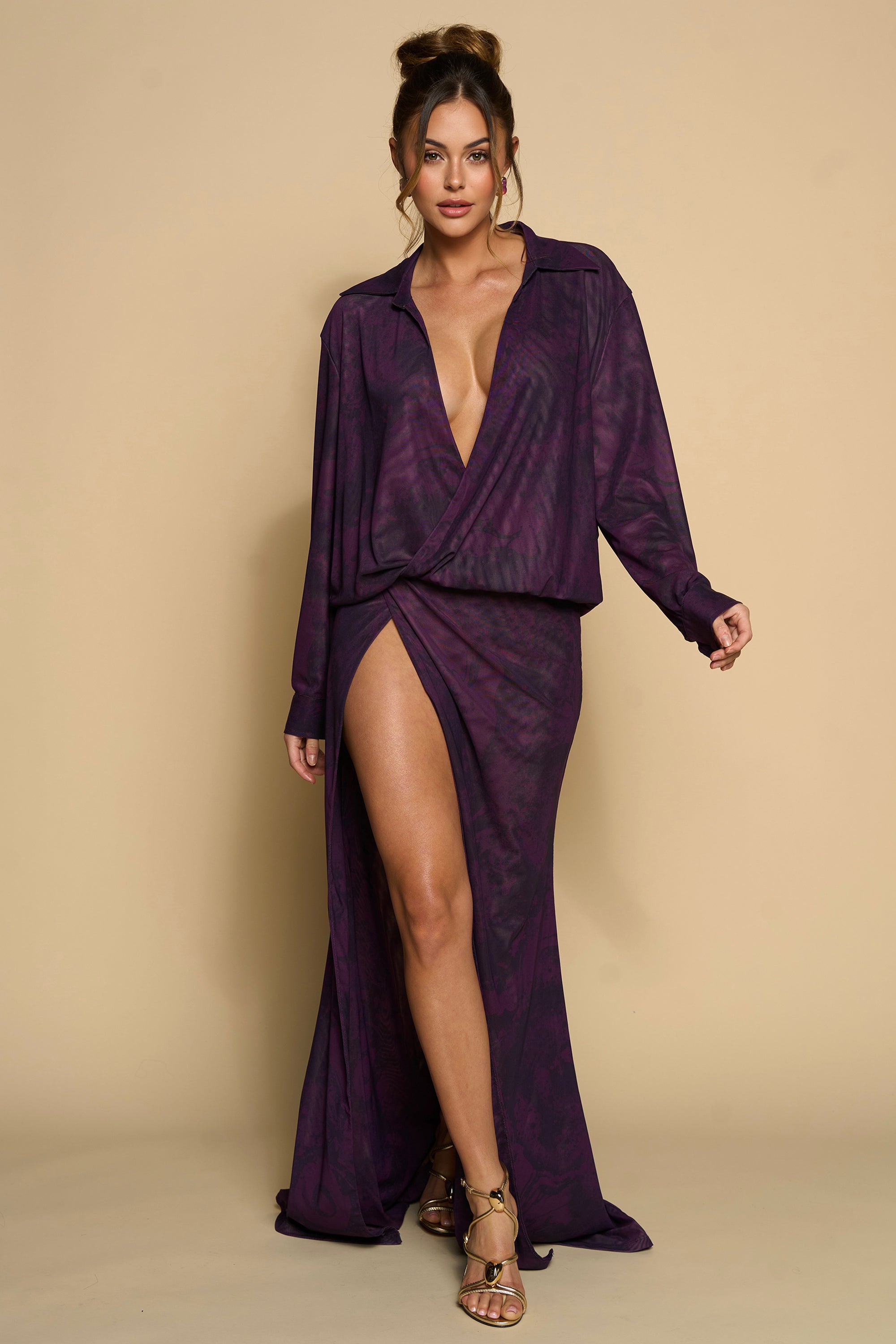 A daring high slit reveals the leg with every step, while the matching plum abstract print adds a hint of texture and visual depth. Crafted from lightweight, flowing double lined mesh fabric that moves with you, this dress makes a statement without trying too hard.