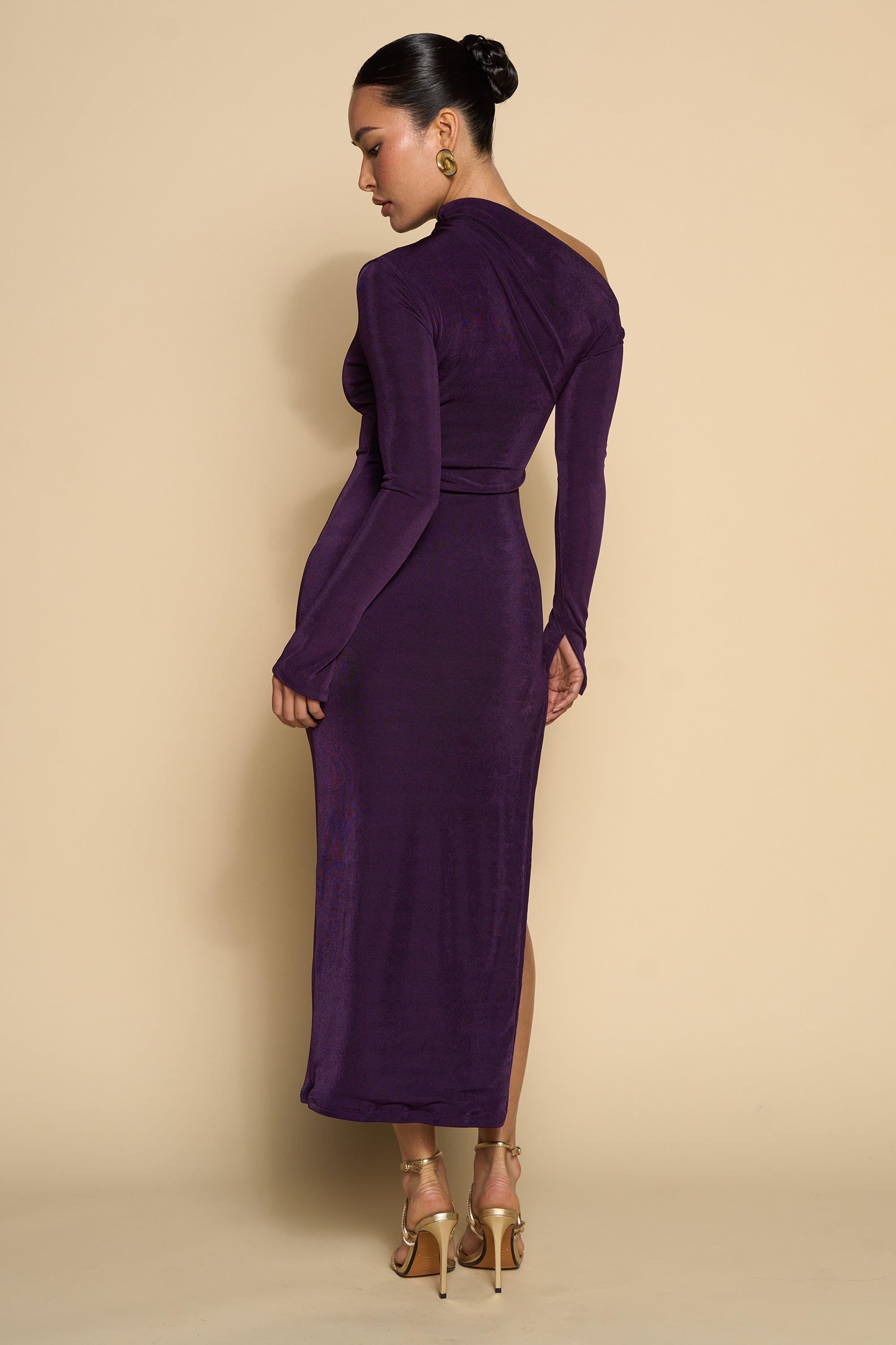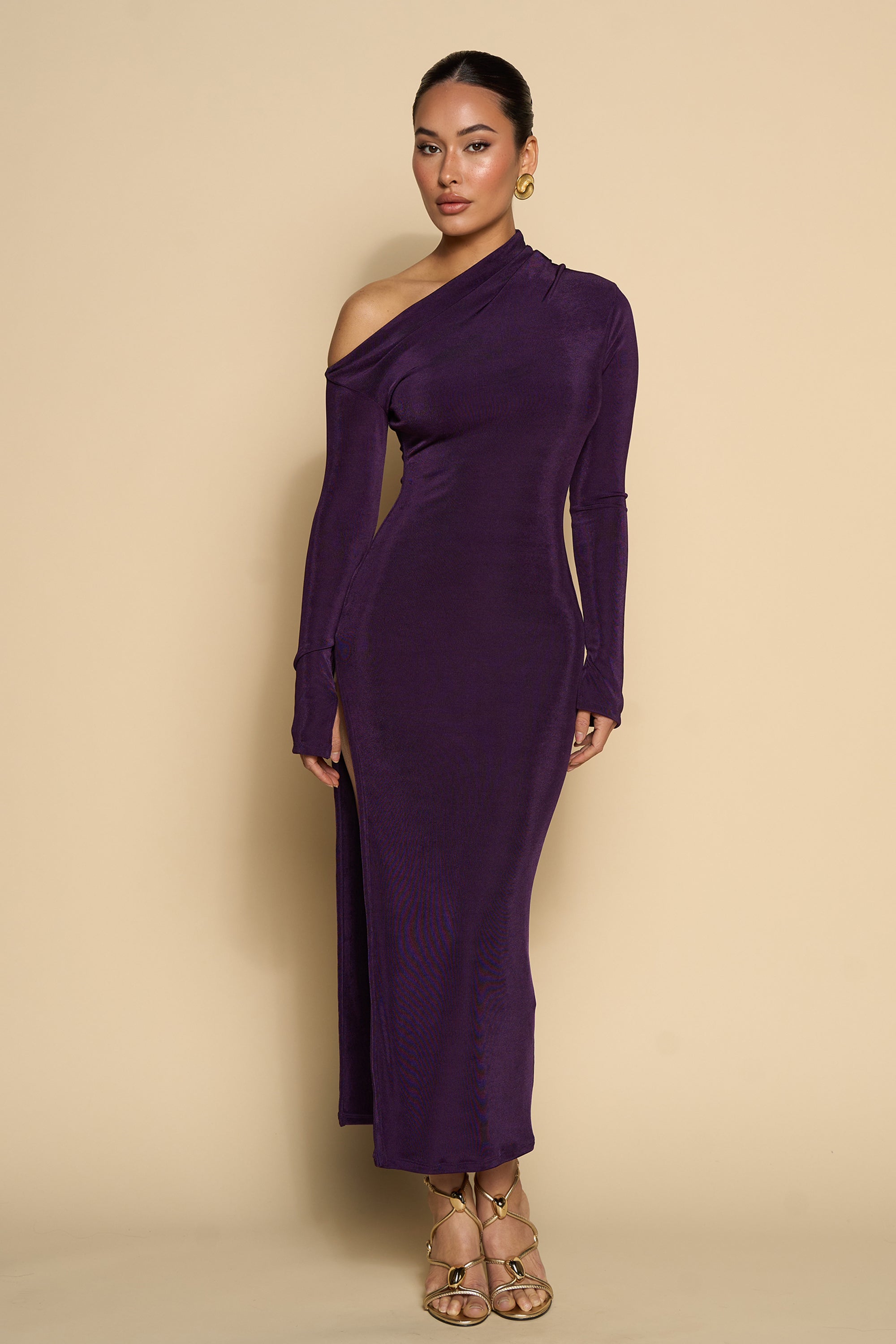 Crafted from a soft stretch fabric that hugs the body in all the right places, this silhouette features an asymmetric neckline, long sleeves, and a sleek ankle-length hem. The rich plum hue elevates the minimal design, while the exposed shoulder adds a touch of drama. Finished with a side slit for ease of movement and allure. Perfect for evening dinners, date nights, or elevated resort wear moments.
