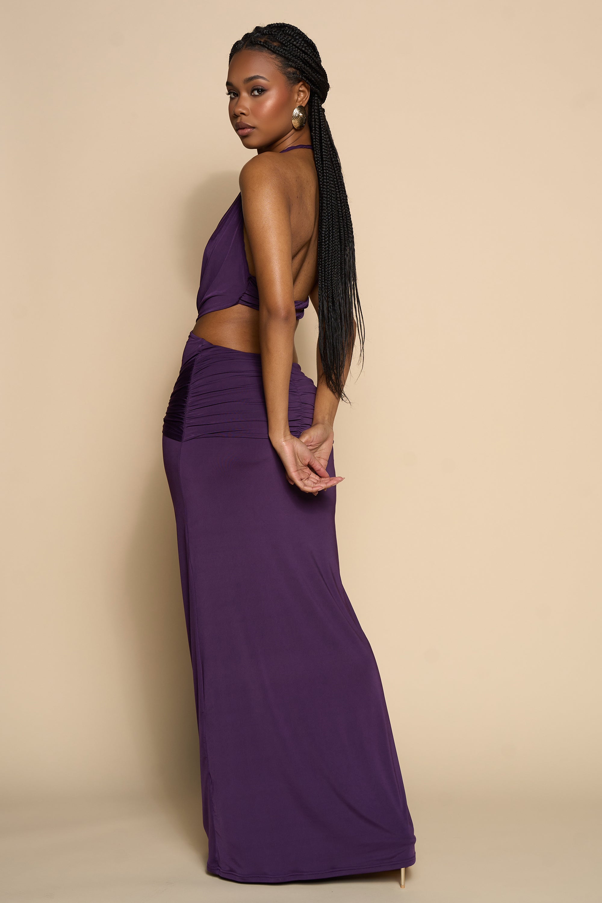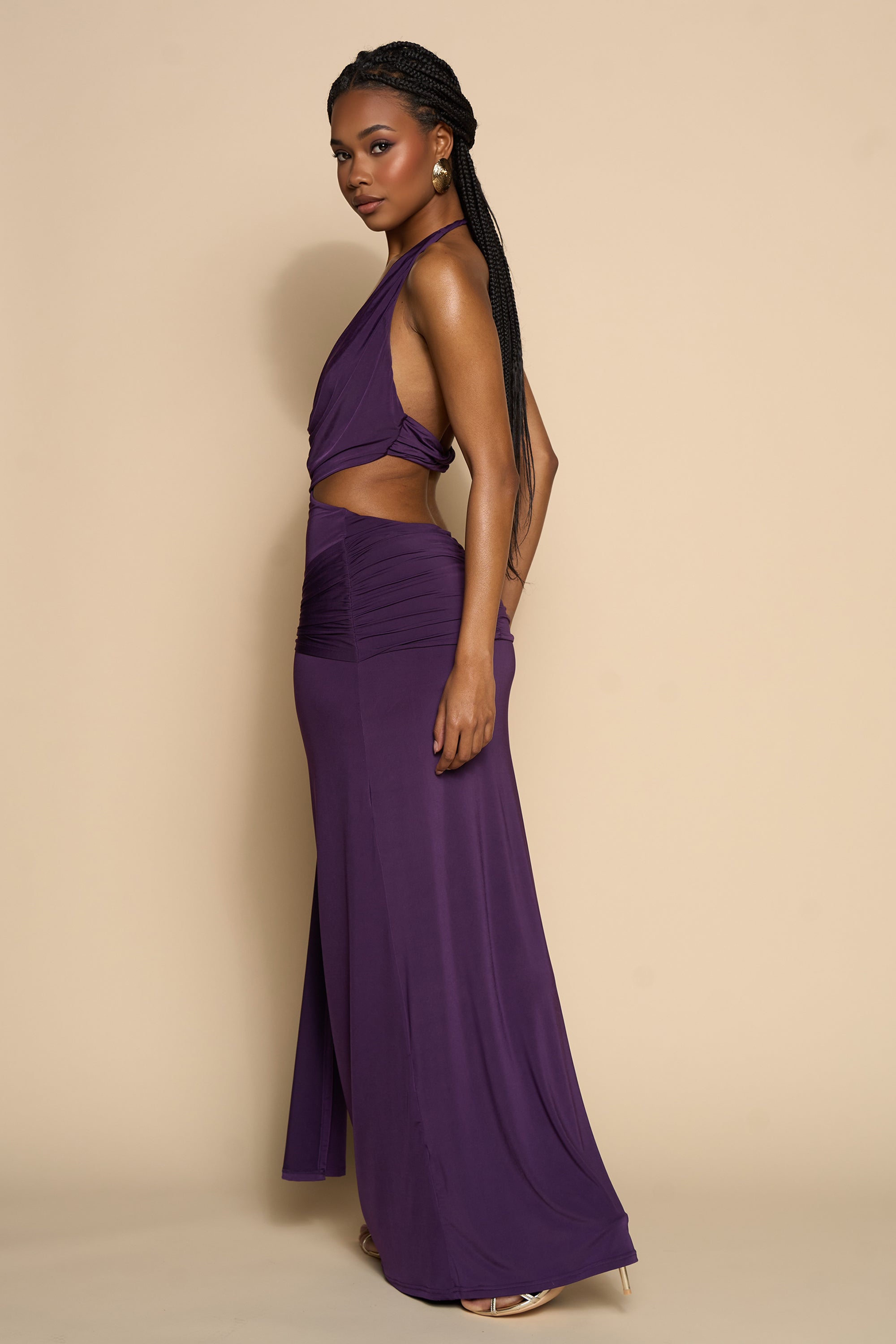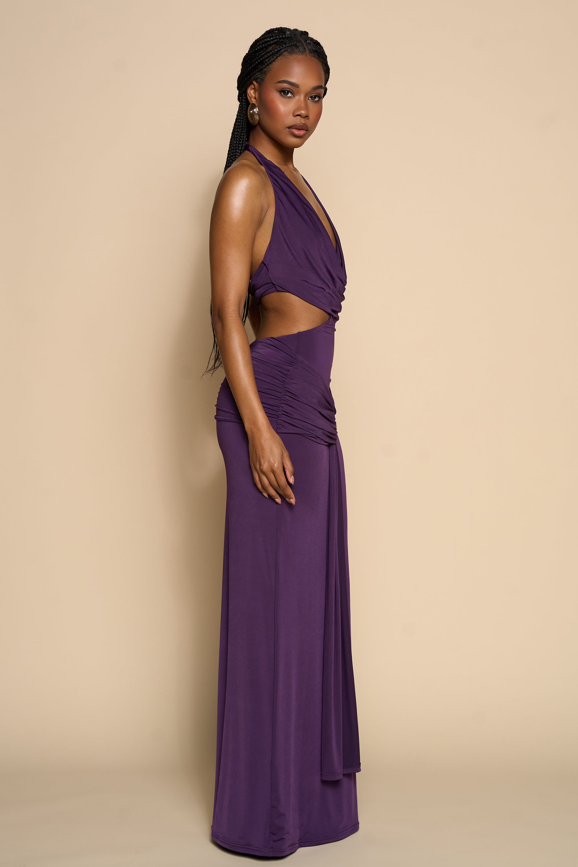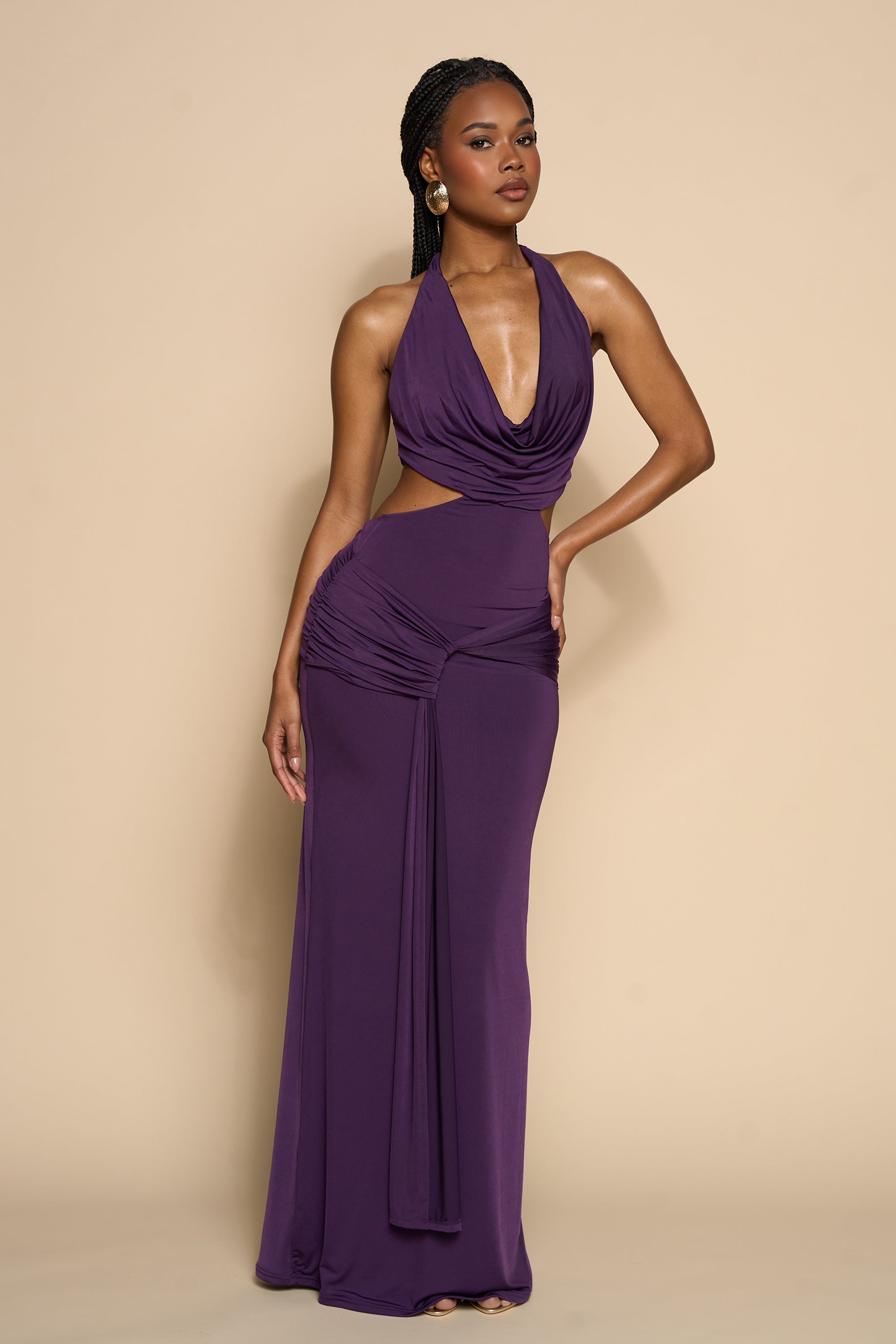 Command attention in this stunning deep plum maxi dress, designed to flatter and sculpt the silhouette. Featuring a daring draped cowl neckline with a halter tie that frames the shoulders and elongates the neck, this style is both sensual and elegant. The dress showcases bold side cutouts that contour the waist and flow into a ruched hip detail, enhancing your natural curves. A dramatic front drape cascades from the waistline for added movement and visual impact. Crafted from a luxe stretch fabric, this floor-length gown hugs the body while offering comfort and fluidity. Perfect for elevated evenings or standout resort dinners.