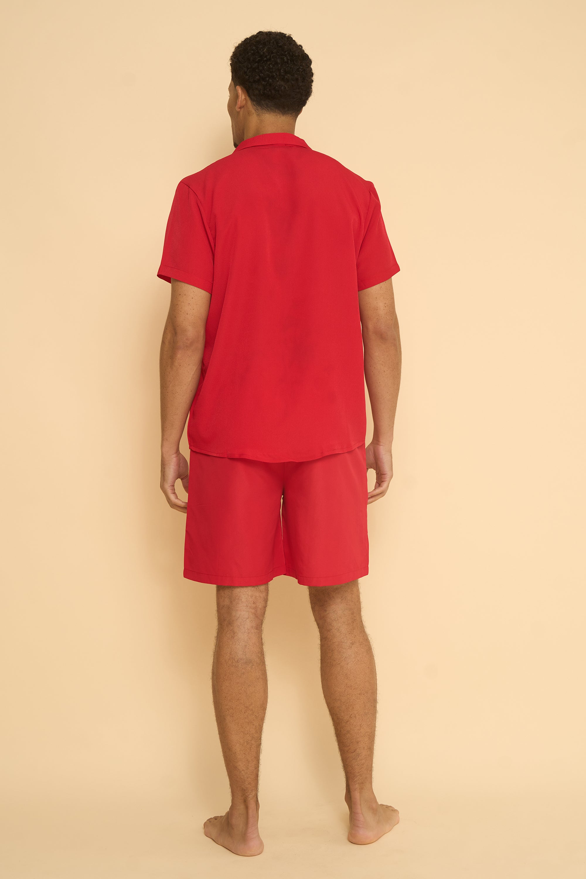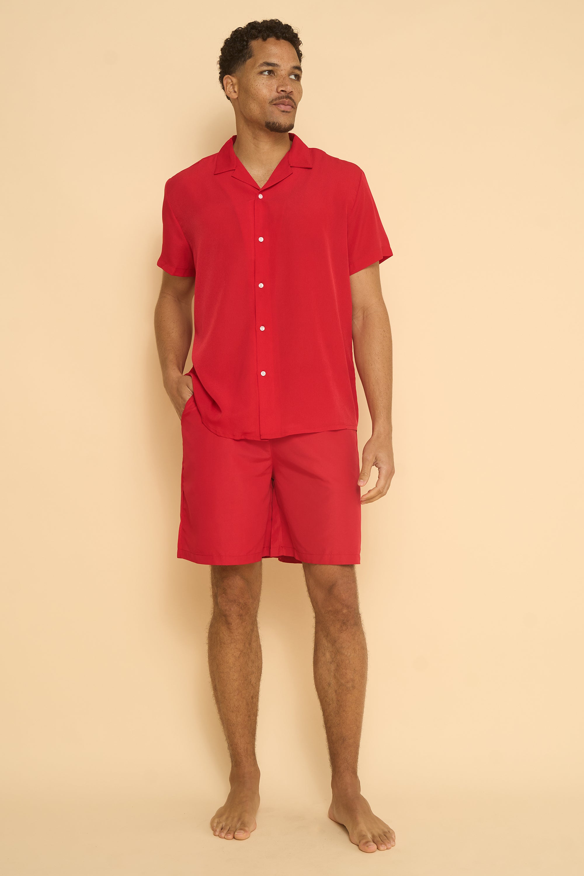 The shirt is a short-sleeve button-down style in a crimson tone. It has a relaxed, open-collar design, giving it a casual and breezy vibe perfect for warm-weather or beachwear settings. The fabric is lightweight and breathable, making it ideal for both comfort and style. The neutral color complements the overall minimalist and sophisticated aesthetic of the outfit. Shirt only.