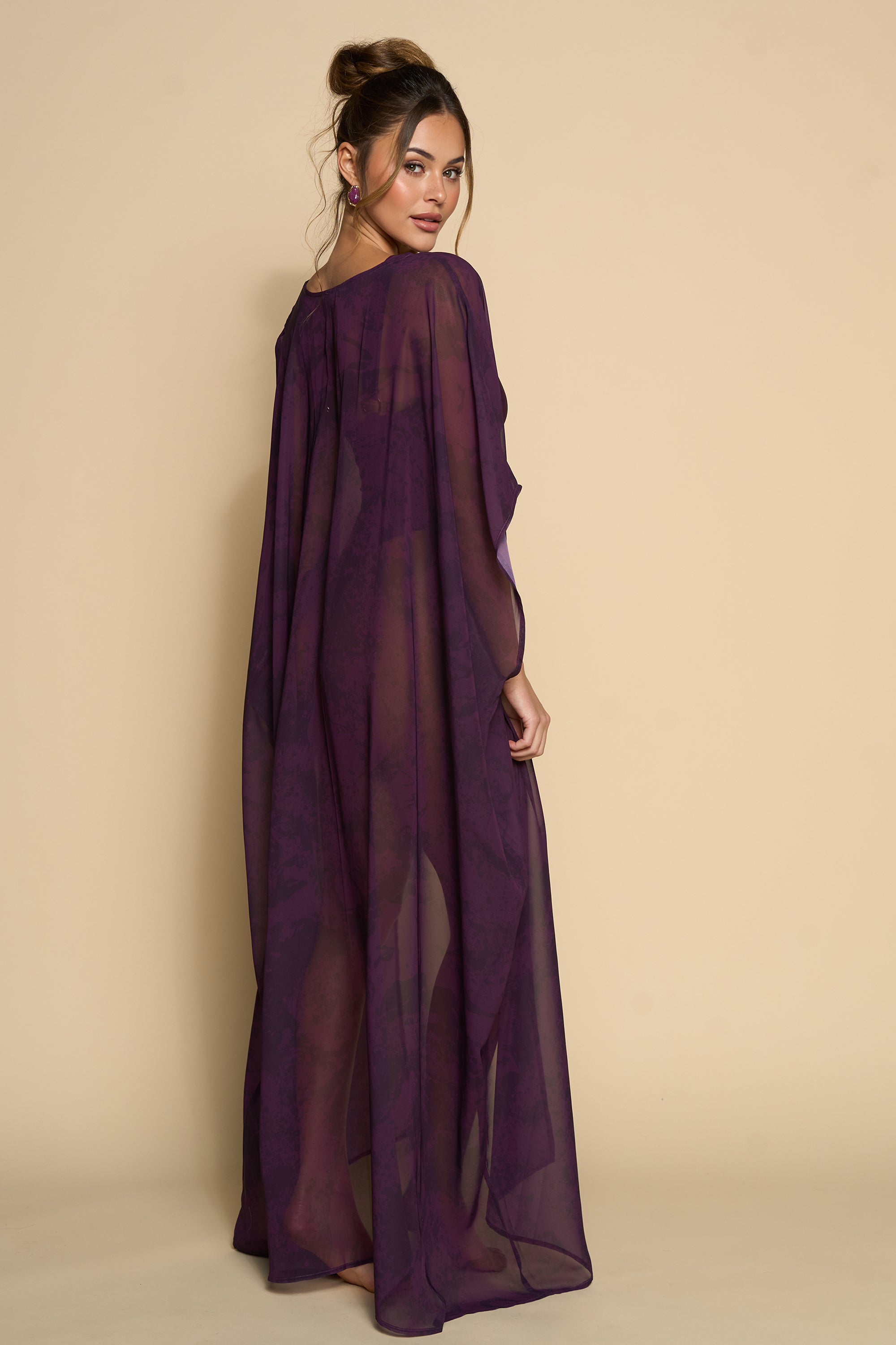 Elevate your resort wardrobe with this luxuriously sheer chiffon cover-up, designed to effortlessly drape over your swimwear. Featuring a deep plum tone with a subtle abstract print, this full-length kimono-style piece flows with movement and adds an air of elegance. The wide sleeves and open front silhouette make it easy to layer while still allowing your swimwear to shine through. Perfect for beachside lounging, pool parties, or sunset strolls. This cover-up adds the perfect touch of glamour to your getaway look. Kimono only.